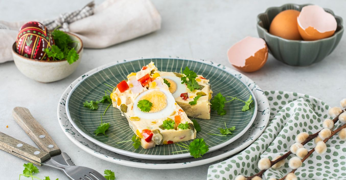 Do vymastenej formy pridáme trochu zmesi, na ňu poukladáme uvarené vajcia a doplníme zvyšnou zmesou.