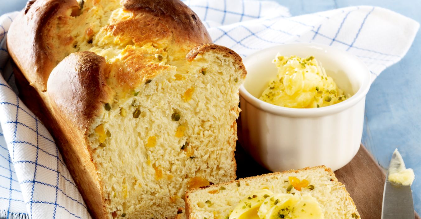 Marhule nakrájame na malé kocky. Zmiešame 140 g masla a med a zmes dáme do malej nádoby. Do predpripraveného cesta pridáme vajce, soľ, zvyšný cukor, mlieko a zvyšné maslo, vymiesime do hladka a necháme ešte 20 minút kysnúť. Do cesta vmiešame marhule, pistácie, citrónovú šťavu a kôru a rozdelíme ho na 3 časti. Vytvoríme z nich 3 rovnomerné pramene, ktoré spletieme do vrkoča, vložíme do vymastenej formy (dĺžka 30 centimetrov) a necháme ešte asi 30 minút kysnúť.