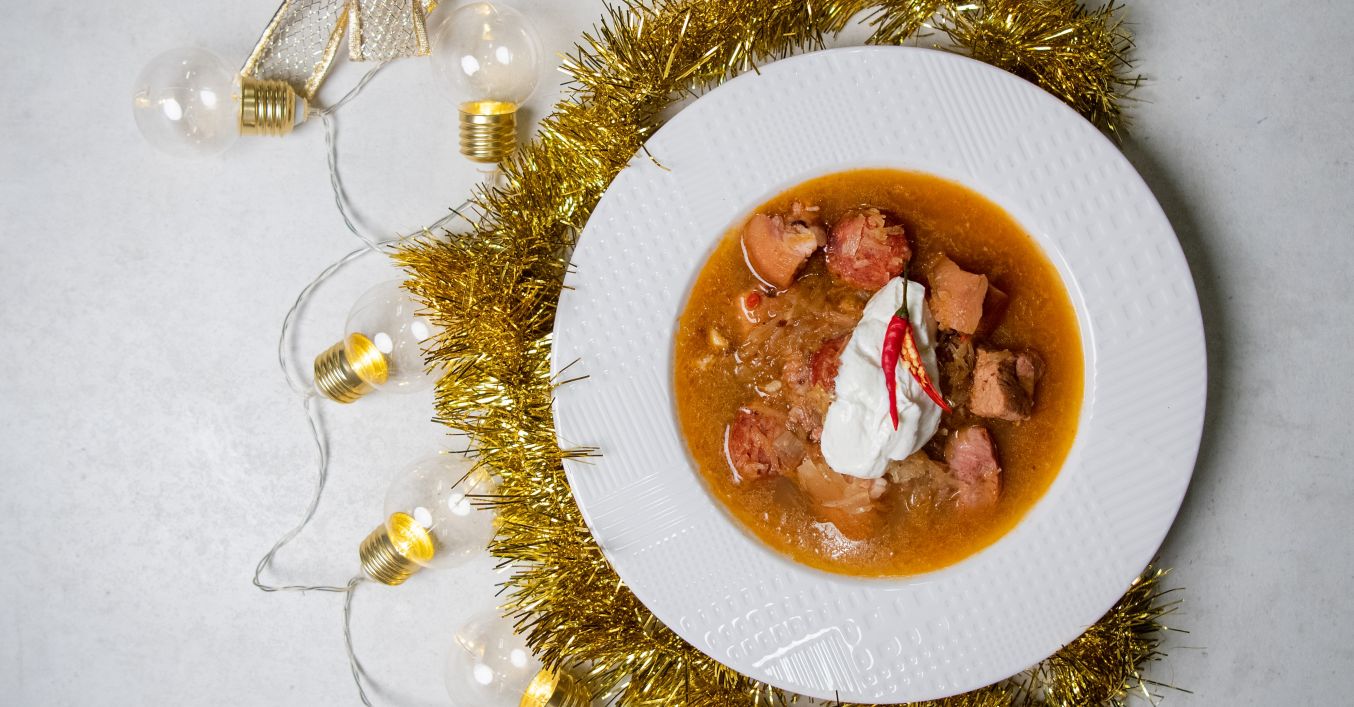 Následne pridáme namočené hríby. Podľa potreby pridáme vodu a kapustovú vodu, ktorú sme si dali bokom. Ďalej varíme, kým údené mäso nie je mäkké. Následne ho vytiahneme, nakrájame a vrátime do hrnca. Premiešame, chvíľku necháme postáť a podávame. Na vrch si dáme kyslú smotanu podľa chuti.