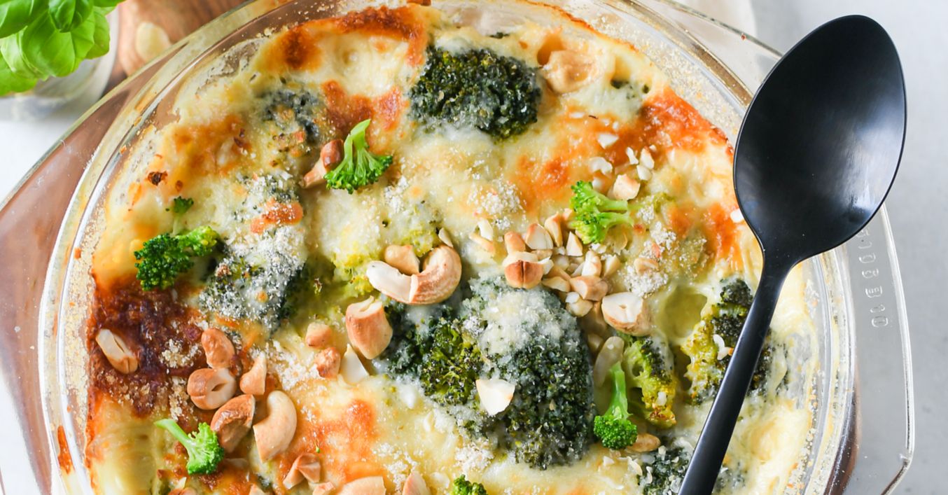 Zapekaciu misku vymastíme maslom a vysypeme strúhankou. Na dno dáme polovicu brokolice, polejeme polkou bešamelu, posypeme polovicou mozzarelly. Pridáme hrsť najemno nasekaných orieškov. Potom vrstvenie zopakujeme so zvyšnými ingredienciami. Na záver vrch ešte posypeme s trochou strúhanky. Pečieme pod alobalom 20 až 30 minút pri 175 °C, potom odkryjeme a necháme zapiecť do zlatohneda.