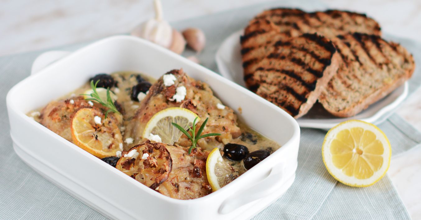 Zapekané kuracie stehná s olivami, rozmarínom a citrónom