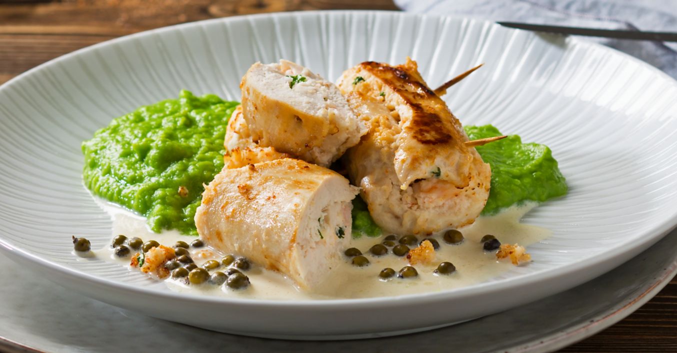 Závitky z kuracích pŕs s krevetovým krémom a hráškovým pyré