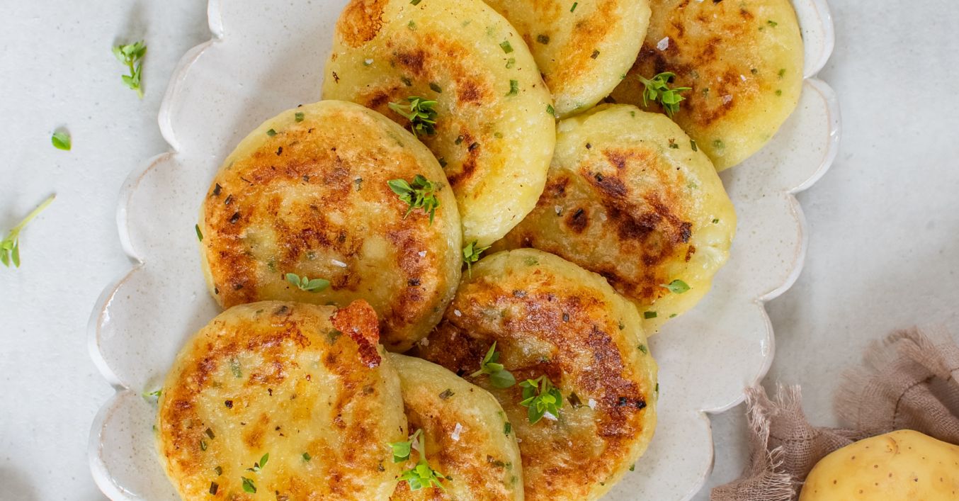 Uvarené zemiaky scedíme a roztlačíme. Ochutíme čiernym korením, sušenou cibuľou a kajenským korením. Pridáme asi lyžicu nasekanej čerstvej pažítky a zemiakový škrob. Poriadne premiešame.