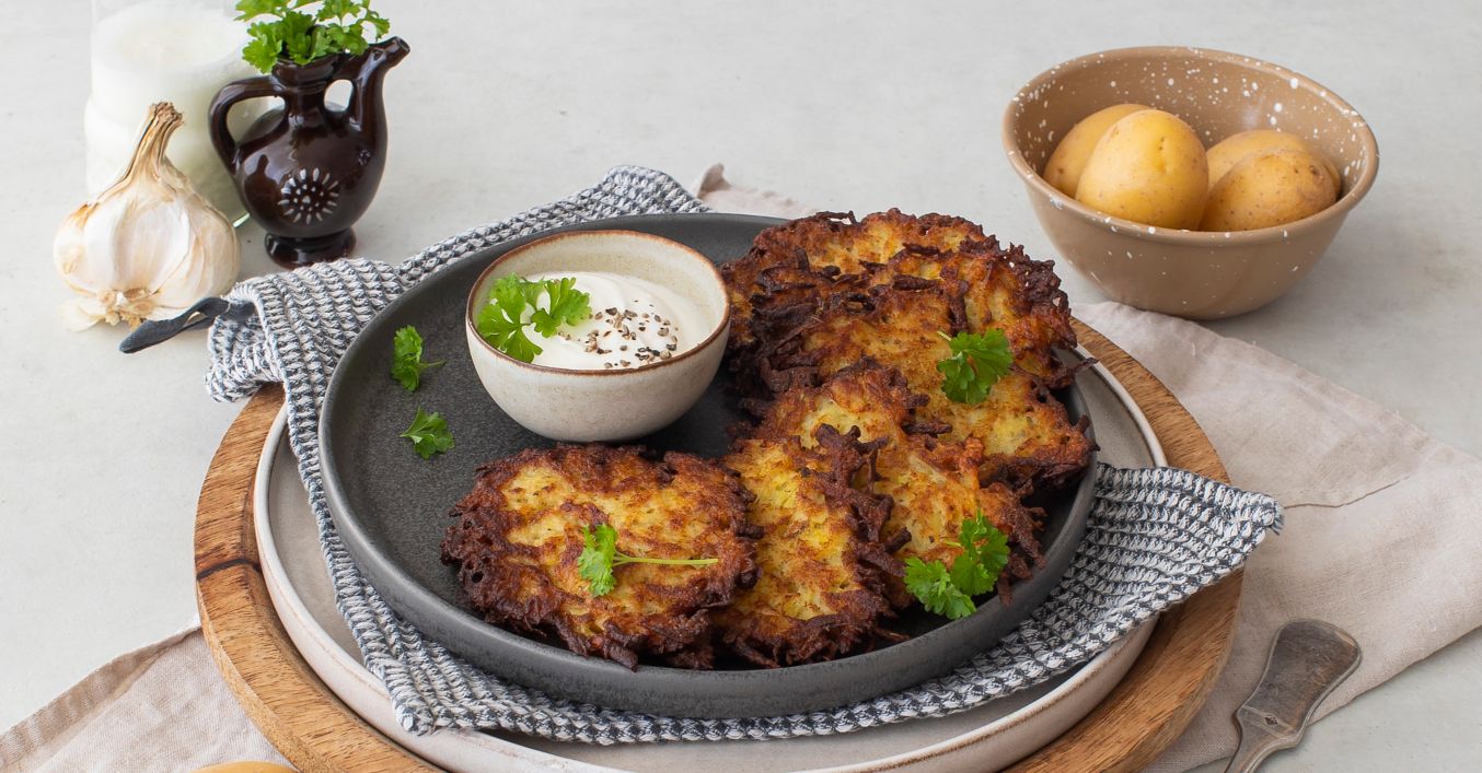 Zemiaky očistíme a nastrúhame na hrubom strúhadle. Necháme chvíľku odstáť a šťavu, ktorú pustia, scedíme. Potom pridáme vajce, hladkú múku a kyslú smotanu, premiešame a pridáme prelisovaný cesnak, majorán, soľ, rascu a čierne korenie. Opäť dobre premiešame.