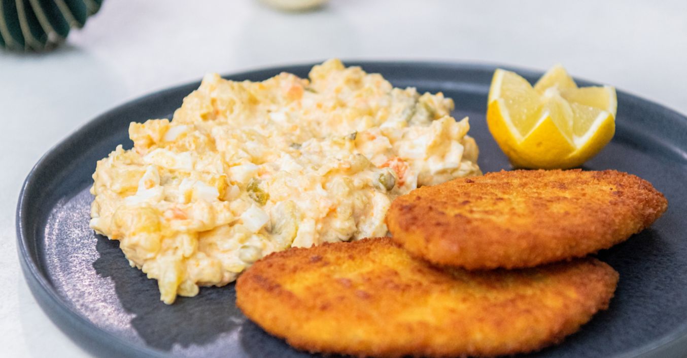 Zemiakový šalát – šmýkľáky s veggie rezňom