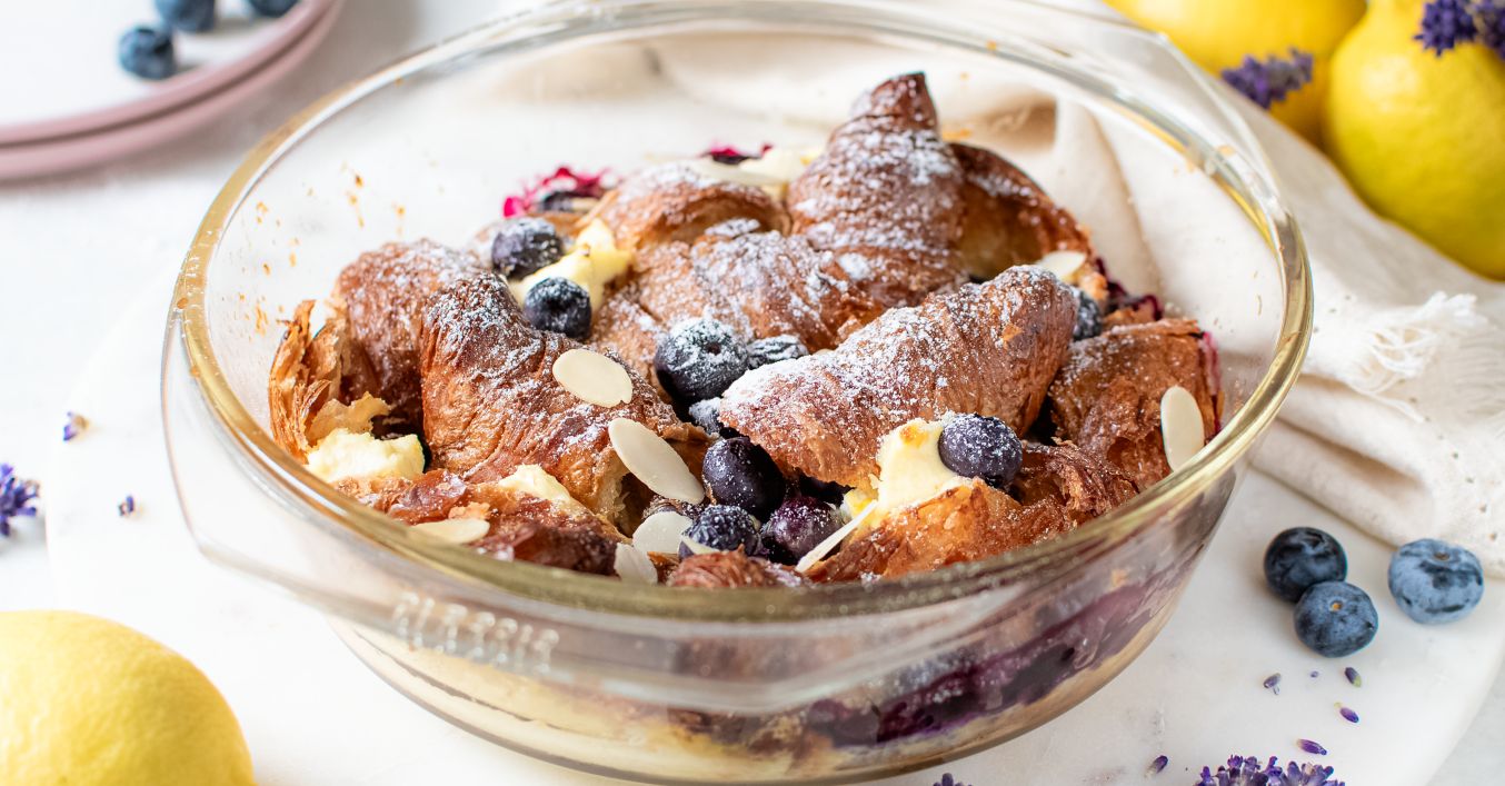 Misu na zapekanie vymastíme maslom. Naukladáme do nej croissanty, posypeme ich čučoriedkami a zalejeme pripraveným rozšľahaným mliekom. Do medzier ešte dáme po lyžičke smotanovej nátierky. Pečieme pri 175 °C asi 30 minút. Podávame ešte teplé a poprášené práškovým cukrom.